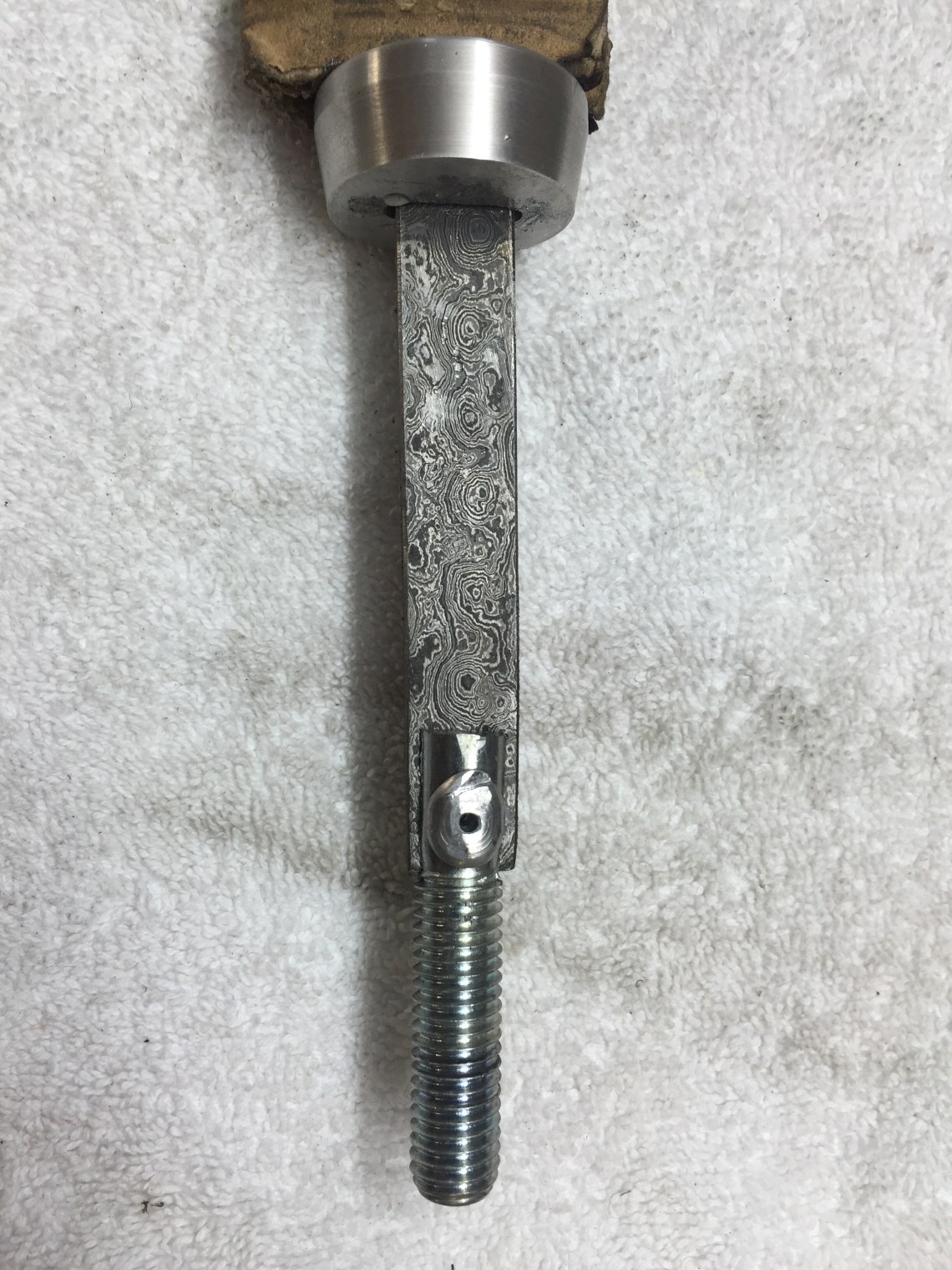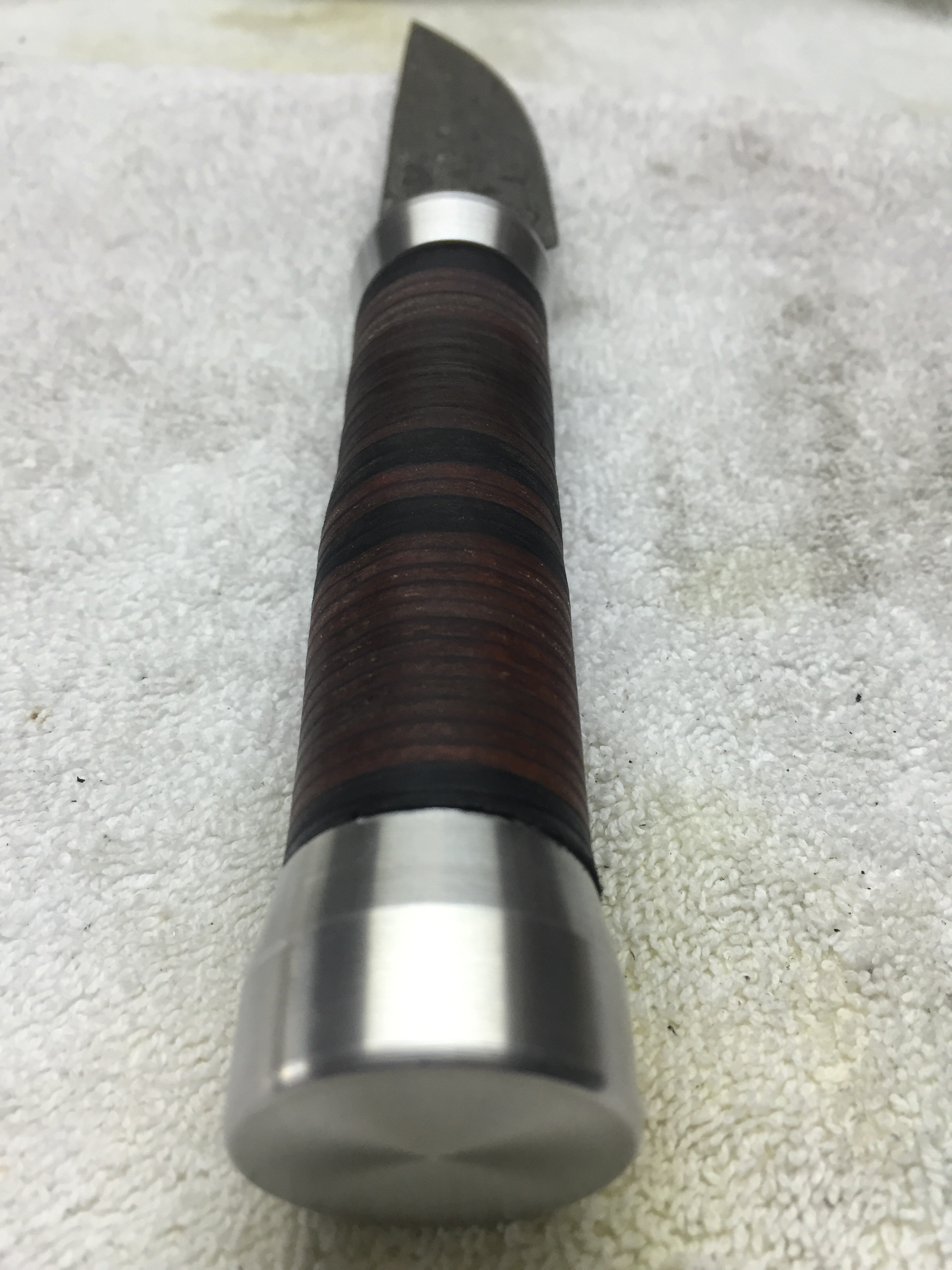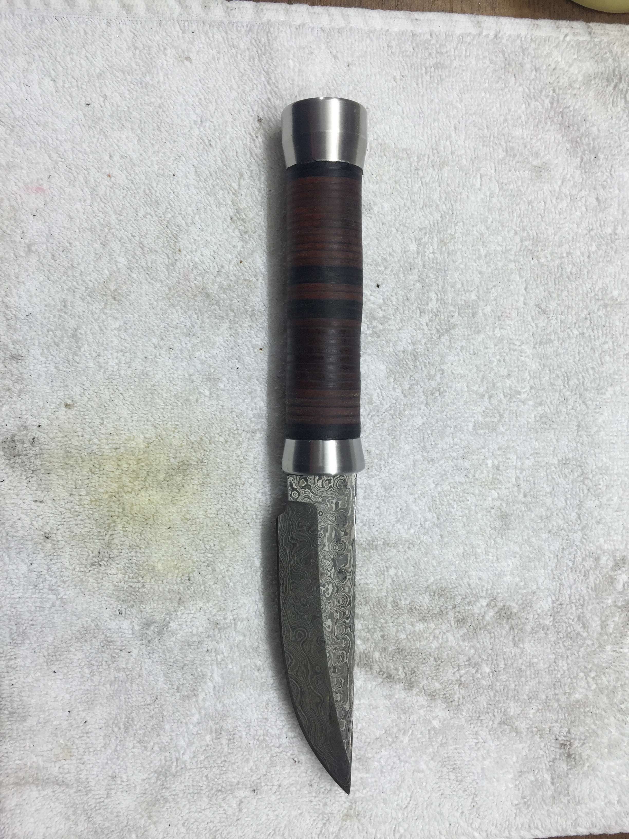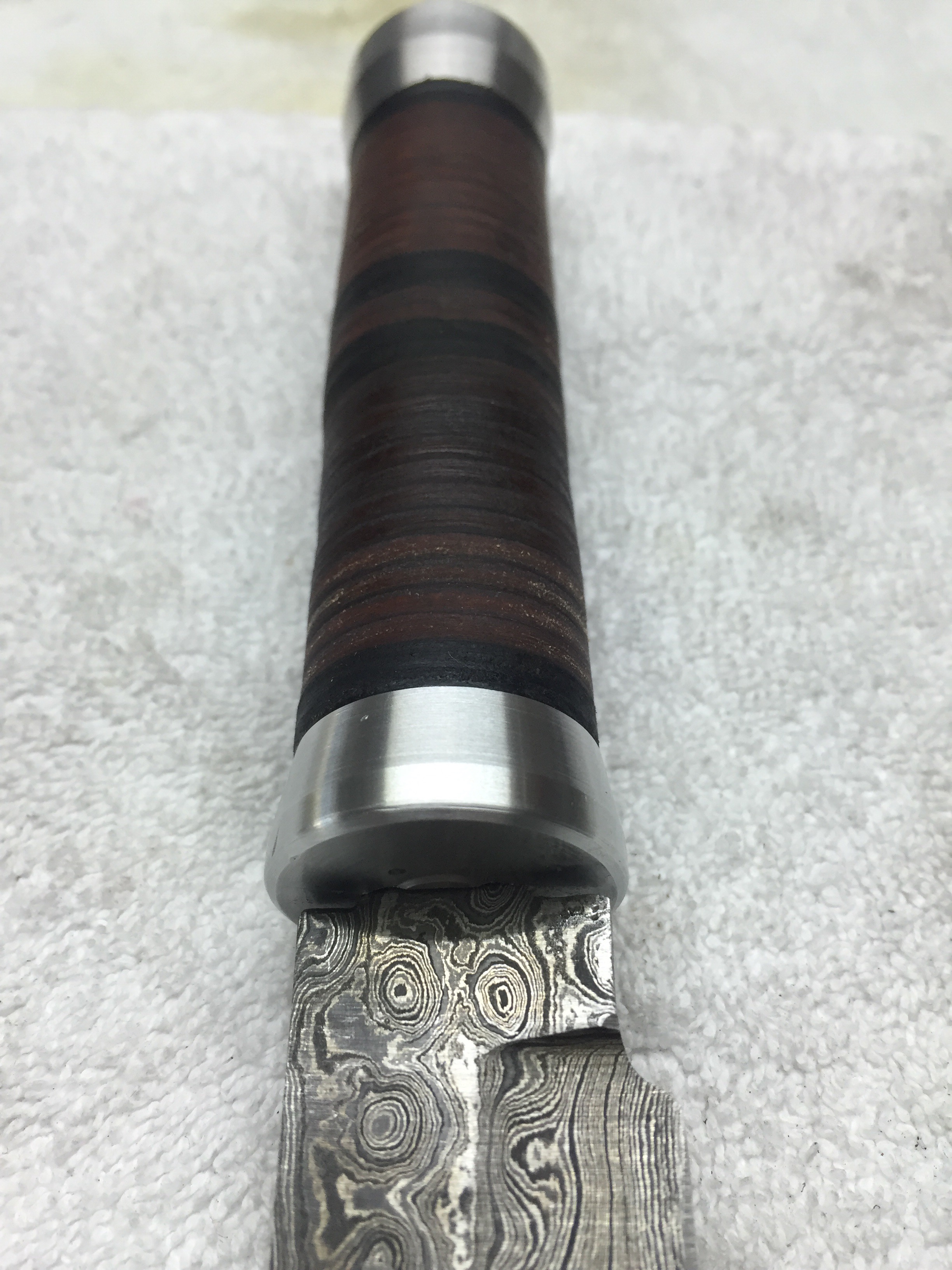 Damastklinge mit 192 Lagen Rosendamast. 120mm Klingenlänge. Gewinde am Erl eingenietet zur Befestigung des Endstückes. Kopfplatte und Endstück aus Alu gedreht. Griff aus zusammengesetzten Lederscheiben. Mit Bienenwachs versiegelt und Mandelöl eingelassen
