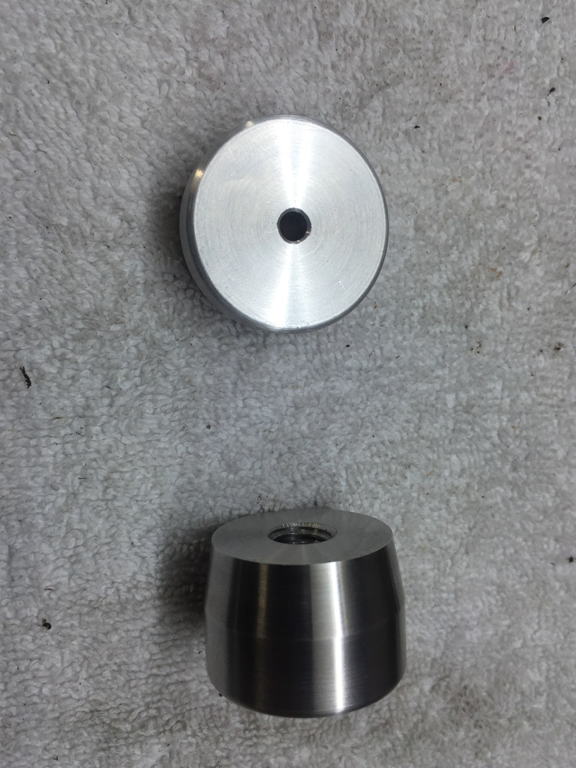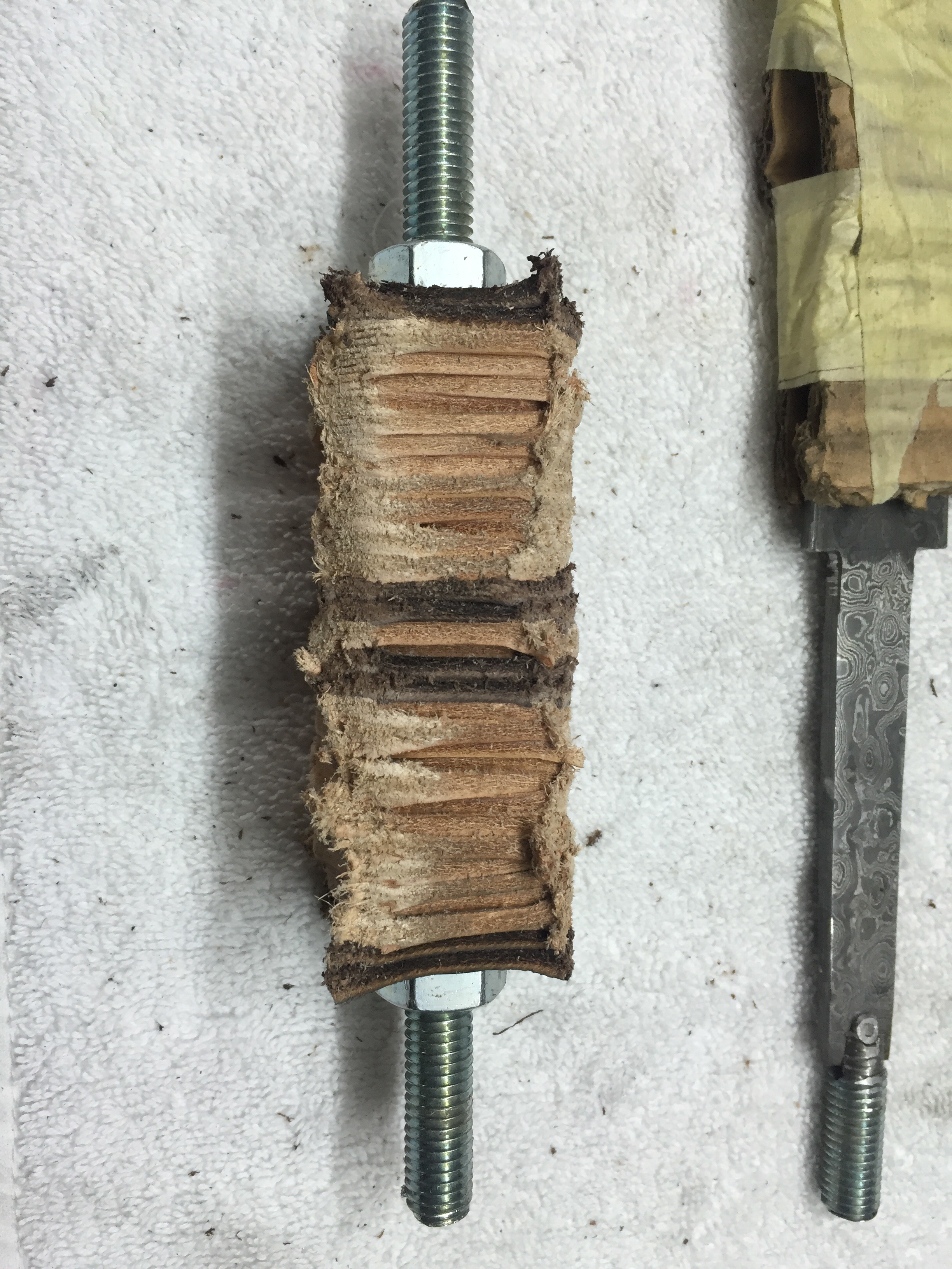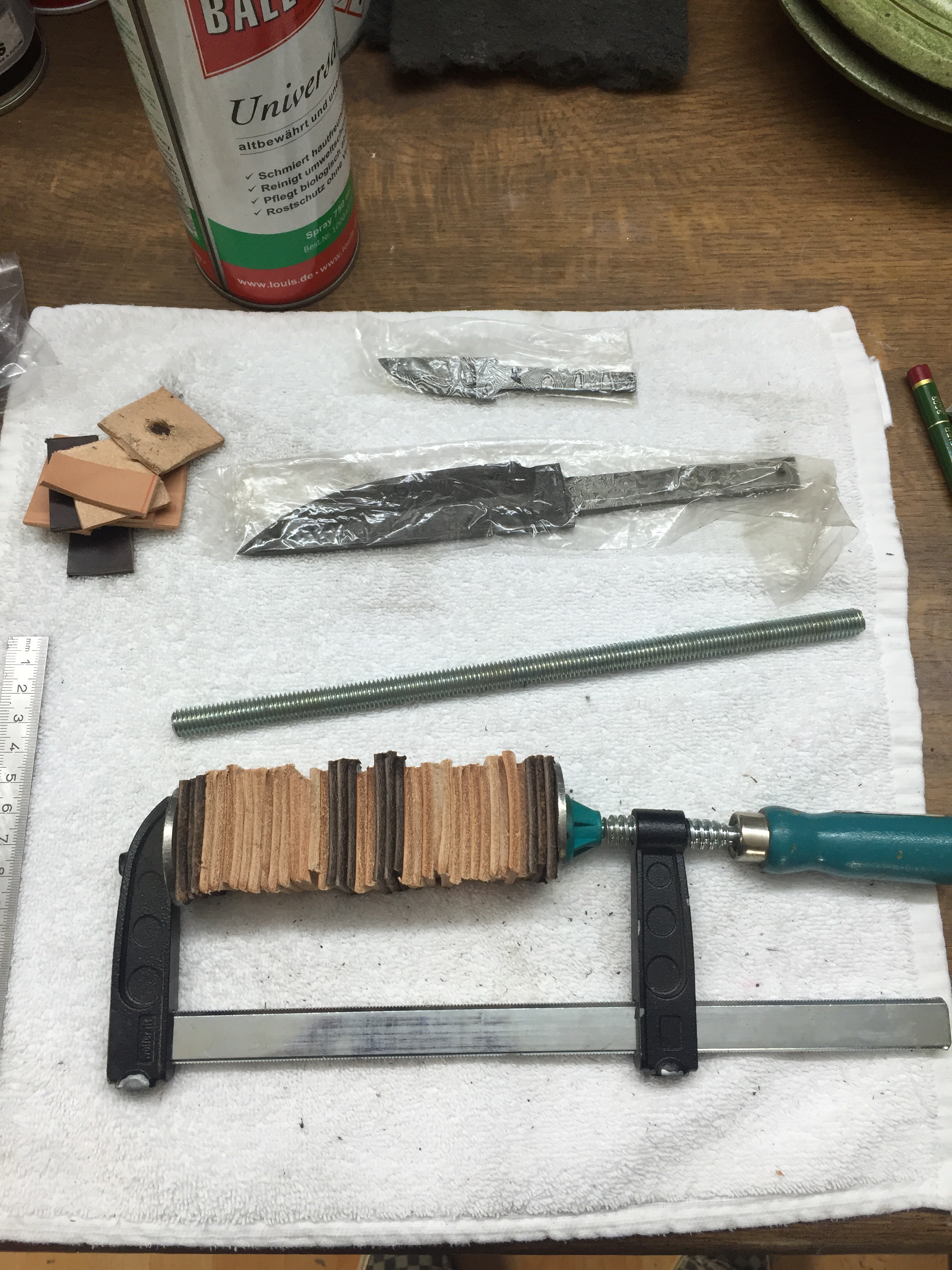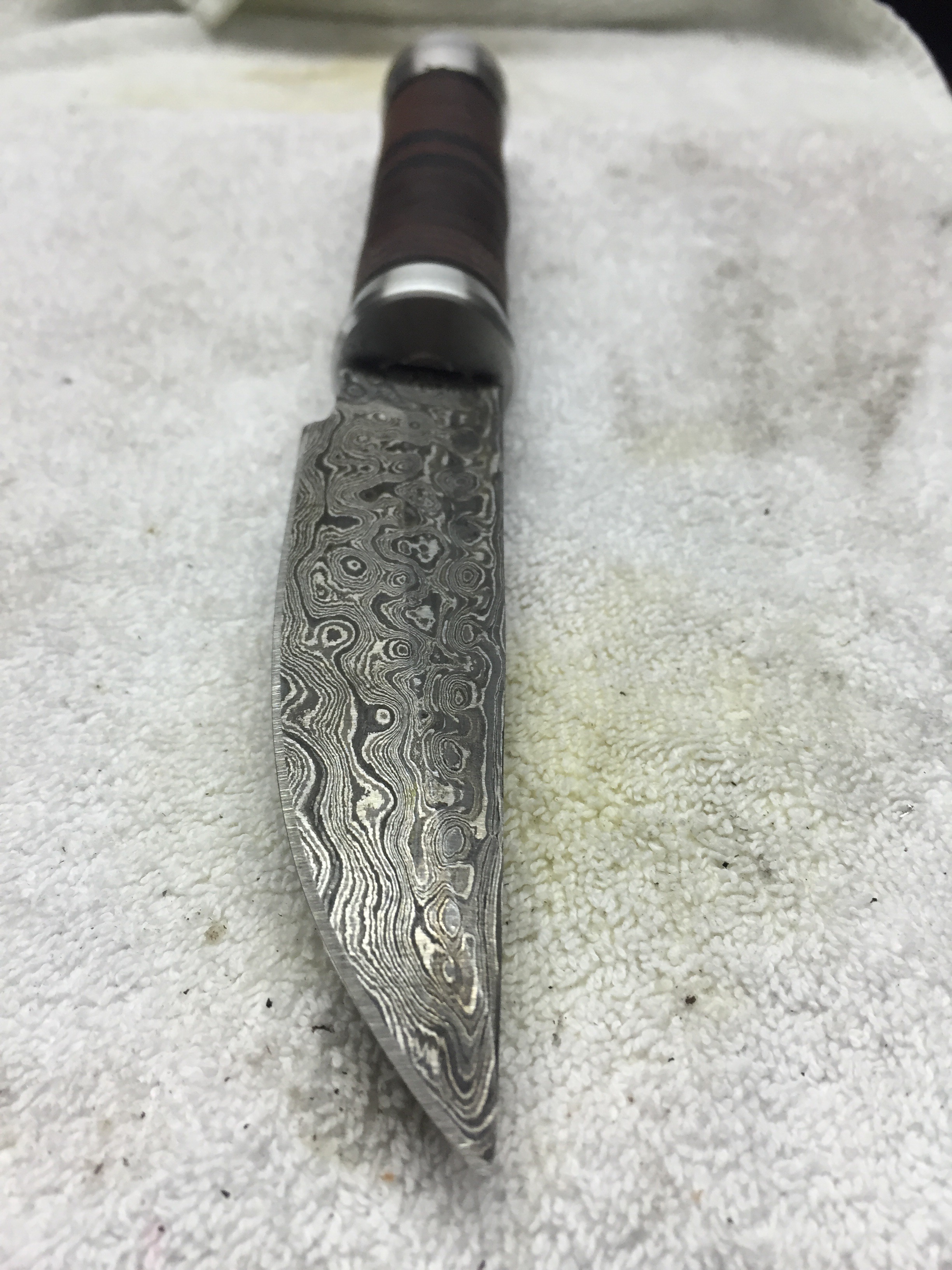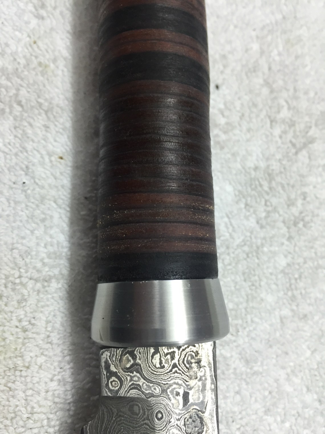 Damastklinge mit 192 Lagen Rosendamast. 120mm Klingenlänge. Gewinde am Erl eingenietet zur Befestigung des Endstückes. Kopfplatte und Endstück aus Alu gedreht. Griff aus zusammengesetzten Lederscheiben. Mit Bienenwachs versiegelt und Mandelöl eingelassen